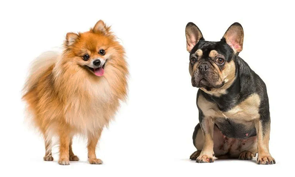 پامرانین: موهای بلند و پفدار دارد و بیشتر شبیه یک توپ پرانرژی است. در مقابل، فرنچ بولداگ موهای کوتاه و صورتی چیندار دارد.